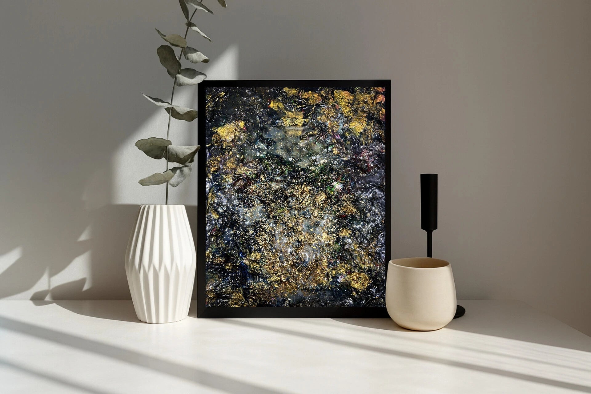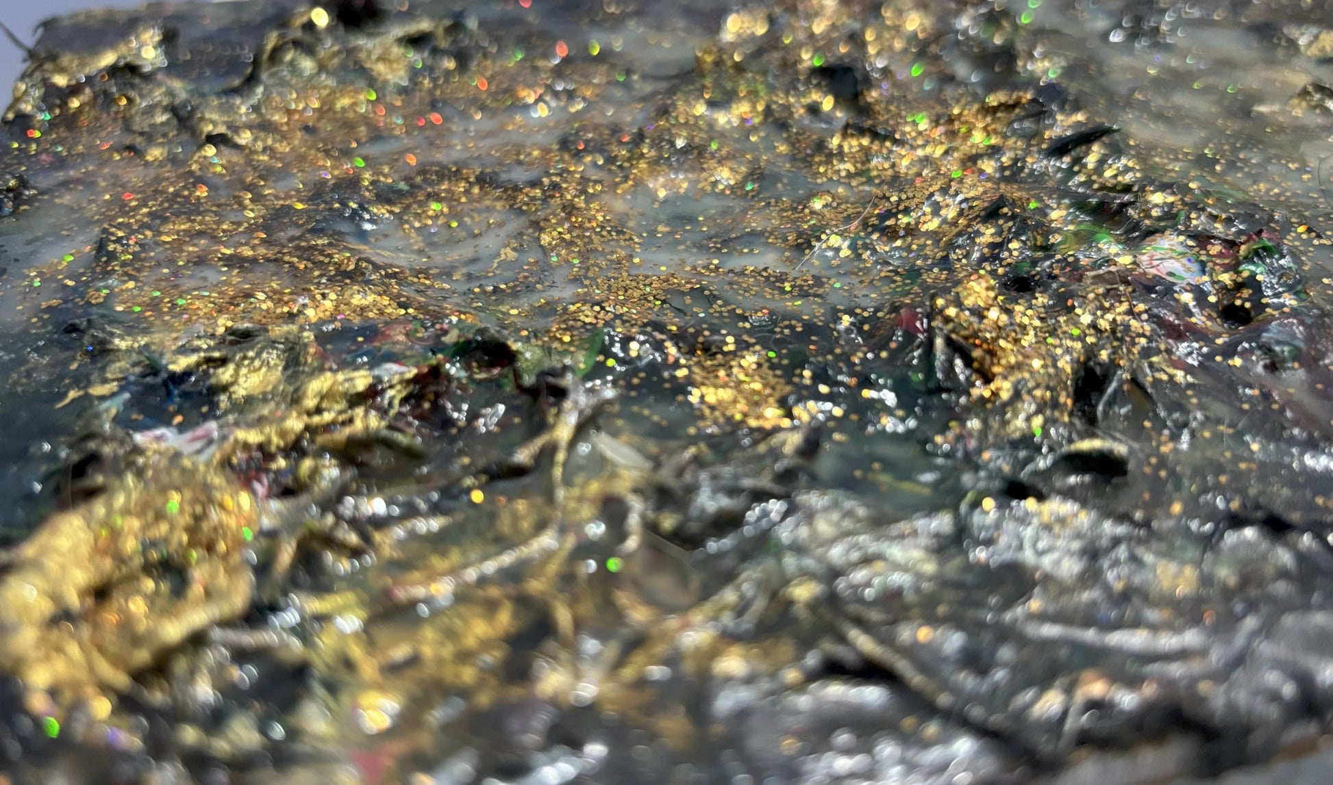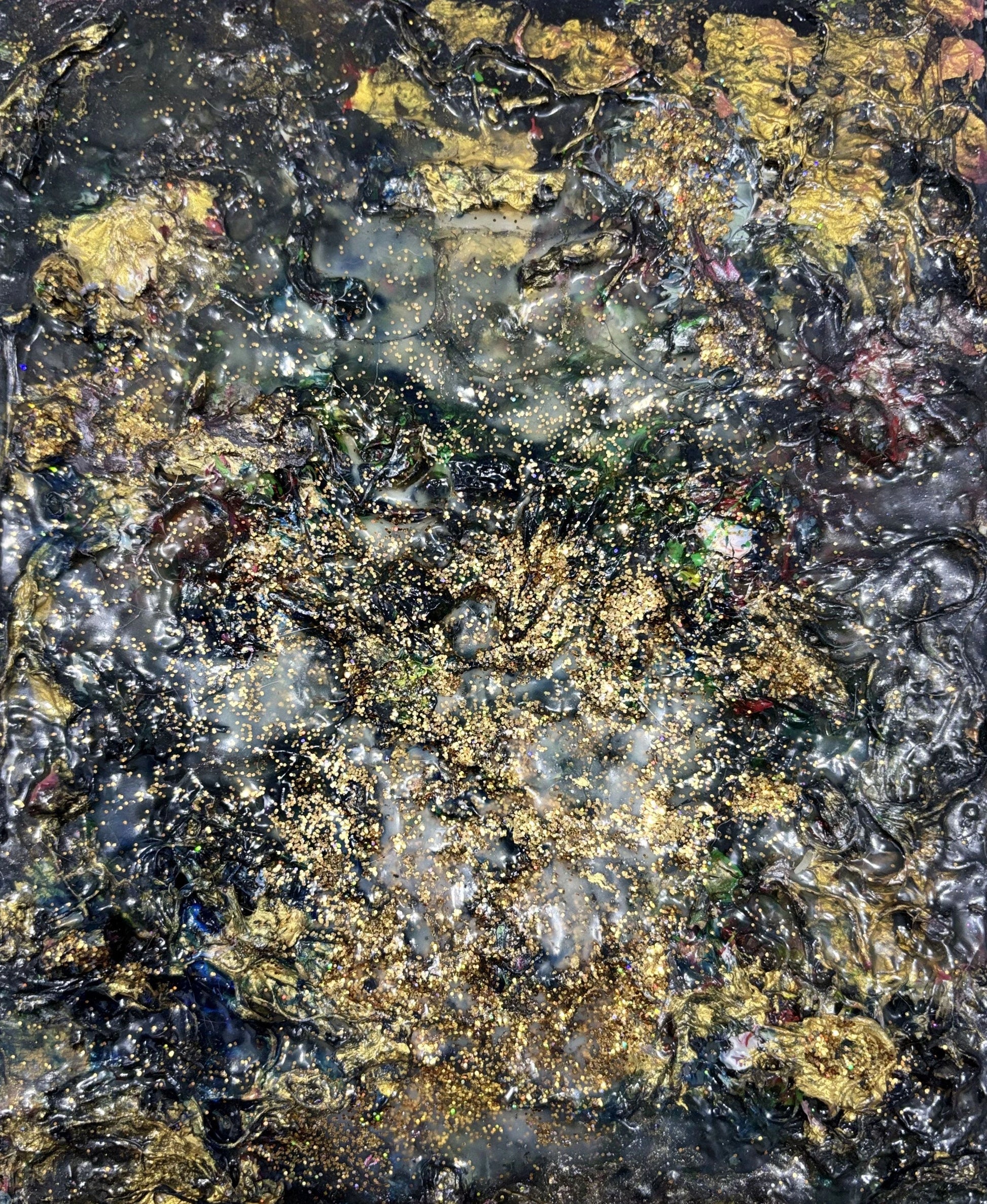 Here, the surface is layered like memory — cracked, stained, and reassembled. Red traces bite through muted tones like nerves that refused to heal cleanly. Gold and warmth appear where erosion should have left nothing, suggesting that worth is sometimes a residue, not an achievement.