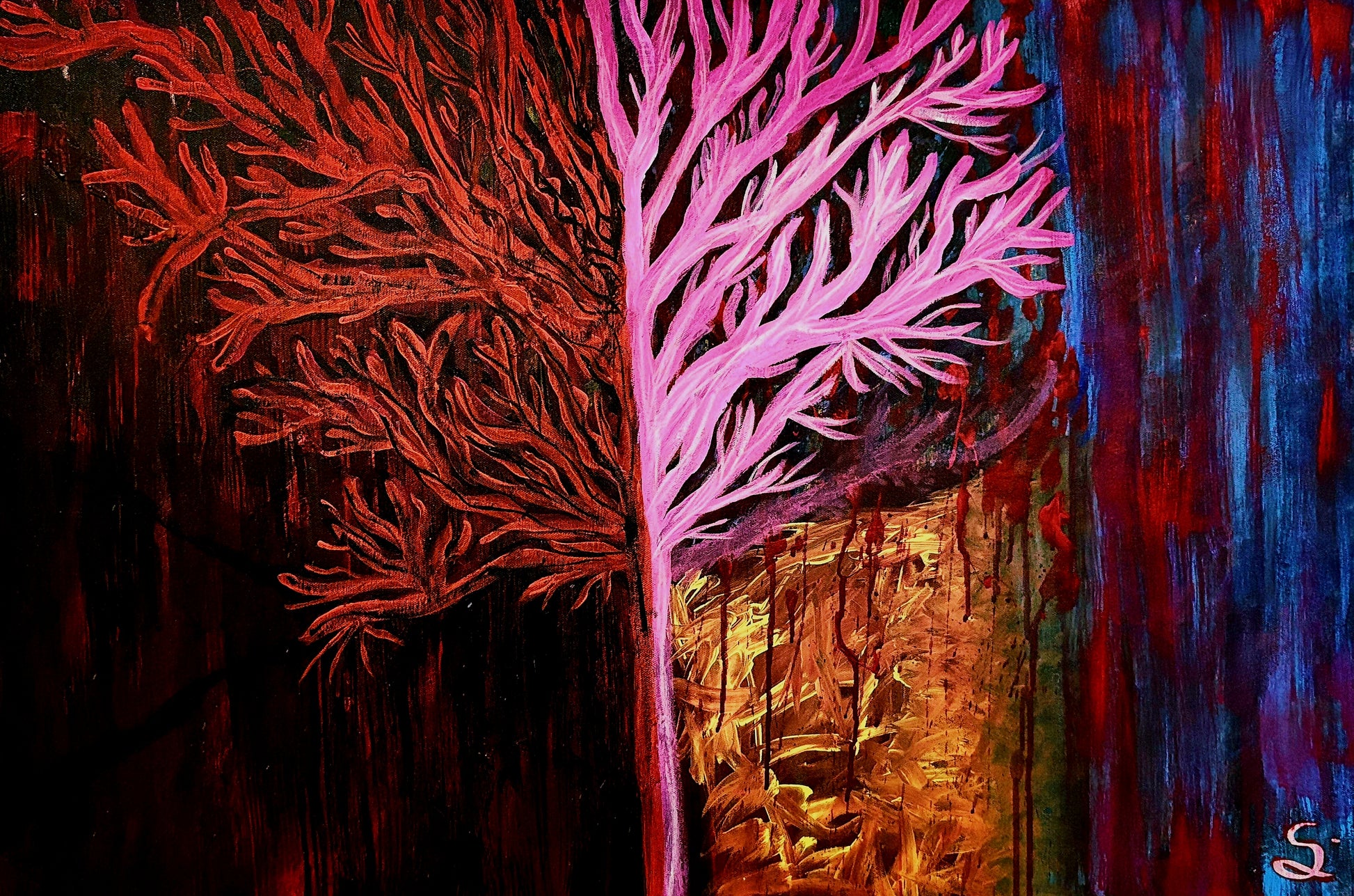 Acrylic on canvas, 90 × 60 × 4 cm, 2025A false guardian that shines warm while feeding on what it protects. Golden life is pulled inward and returned as cold blue, revealing how trust can be consumed in silence. Part of the Sweet Pill series.
