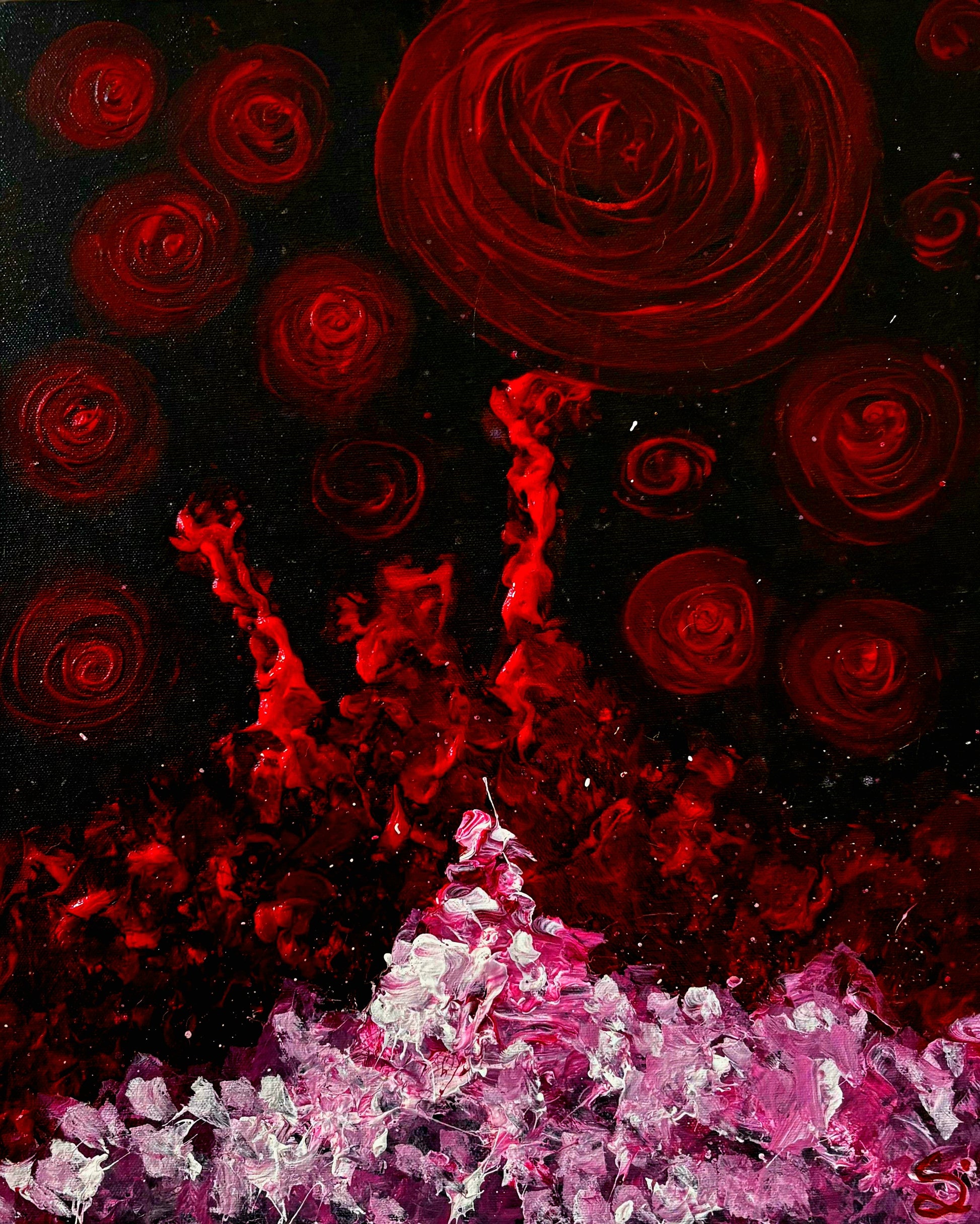In From the Scald, the red does not signify flames—it marks what survives them. It is the mineral of the self after pressure, a record of what refuses to disappear. The painting unfolds like an aftermath: quiet, volatile, and honest. What rises from this heat is raw life, returned to its most essential form.