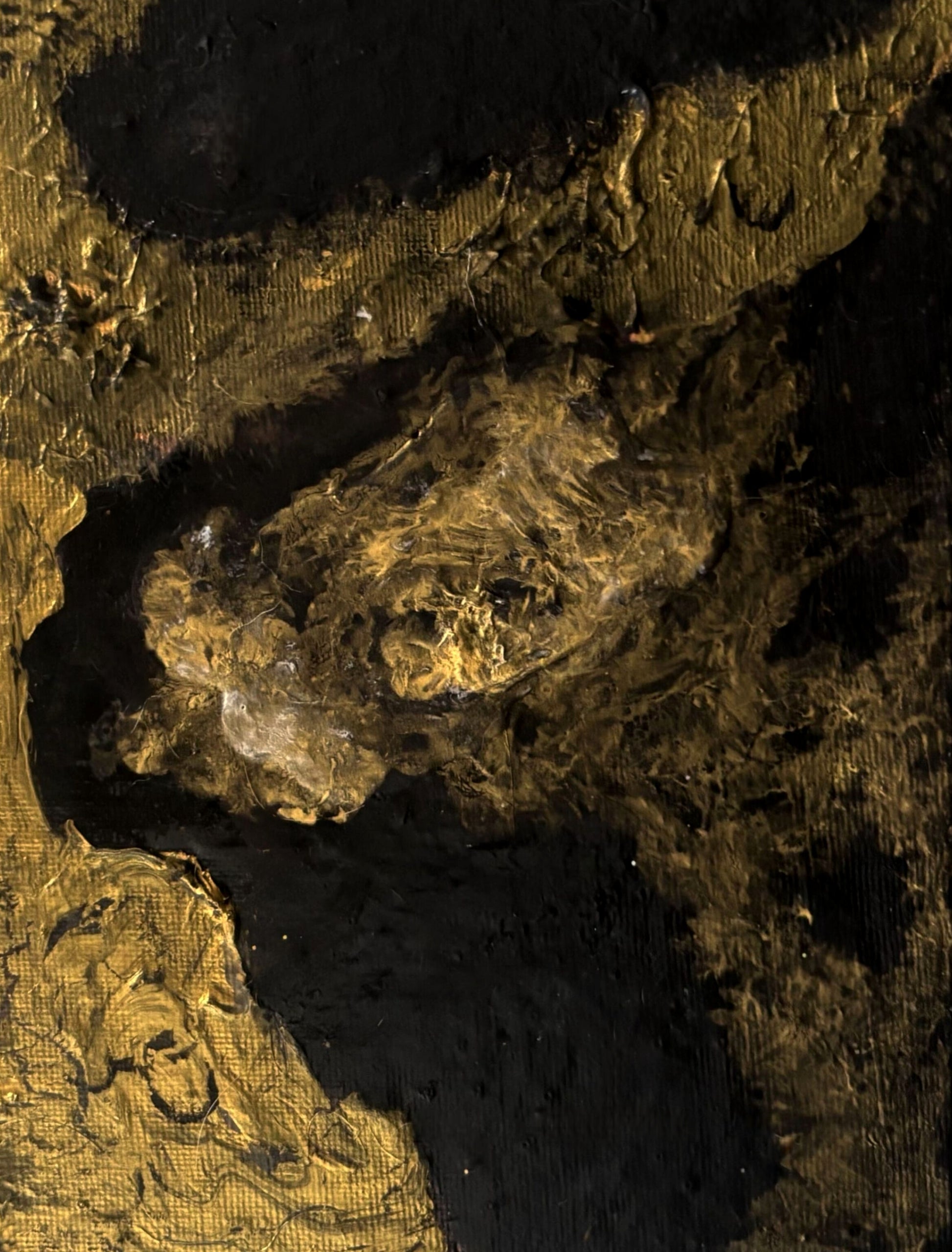 Each section of this painting feels like a conversation between ruin and resilience. The gold’s irregular shine is memory — what remains of faith after the fire. The black’s viscous calm is acceptance — not defeat, but understanding. The entire work exists in that sacred in-between space: where despair ends and endurance begins.
